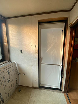 入口枠を交換するため、既存の壁材や枠まわりを丁寧に取り外し、新しい入口枠を慎重に仮合わせし、歪みがないか・扉の開閉に問題がないかなど細かくチェック。