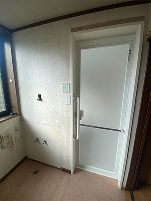 今回の工事は、ユニットバスを交換するタイミングでの洗面室側の床と壁紙の貼替えのご依頼でした。また、ユニットバス入口枠の交換工事も同時に行いました。